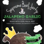 Supreme Beef Jerky offers a gourmet Halal beef jerky with a bold jalapeno garlic flavor. 2.5 ounces of premium jerky comes packaged in a bag for easy storage. The jerky is made with humanely raised, source-verified Zabiha Halal beef