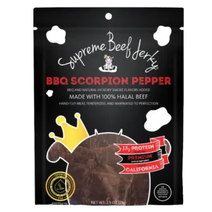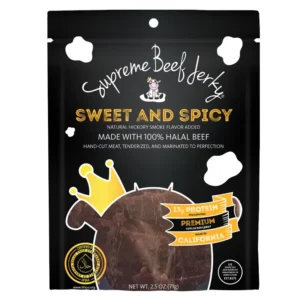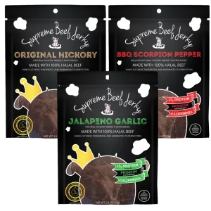 Supreme Beef Jerky offers a gourmet Halal chicken jerky with bold buffalo chicken flavor. 2.5 ounces of premium jerky comes packaged in a bag for easy storage. The jerky is made with humanely raised, source-verified Zabiha Halal chicken. The chicken is sourced from poultry farms with management practices that maintain the highest quality in Halal standards. Prime cuts of 100% USDA poultry are selected and marinated to perfection. All-natural ingredients are used to offer the perfect taste in every bite.